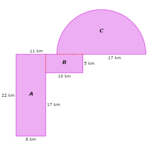 Start with rectangle A. Rectangle A is 8 kilometres wide and 22 kilometres tall.